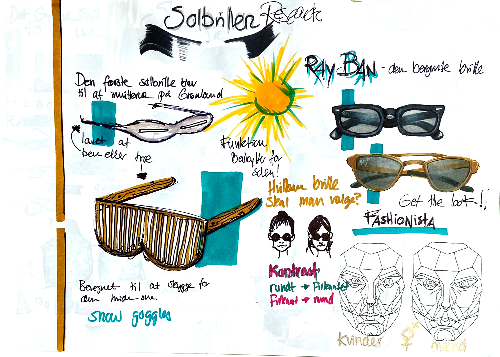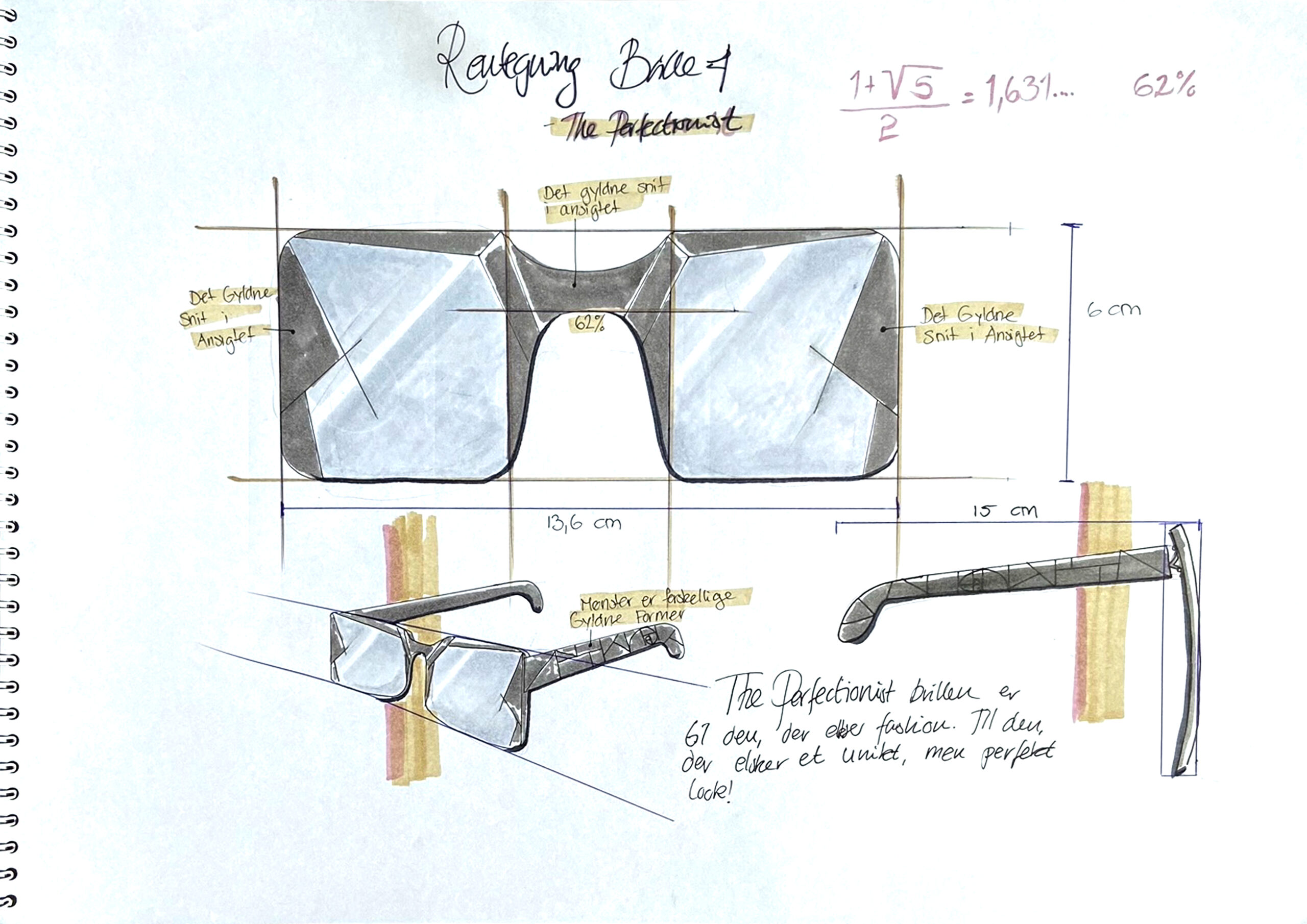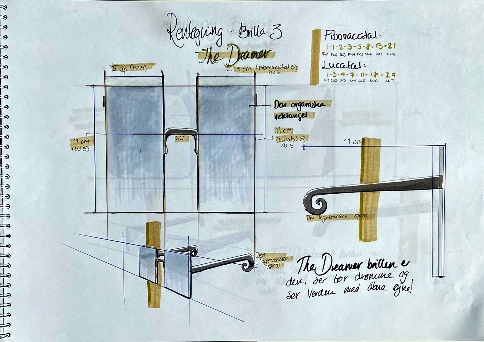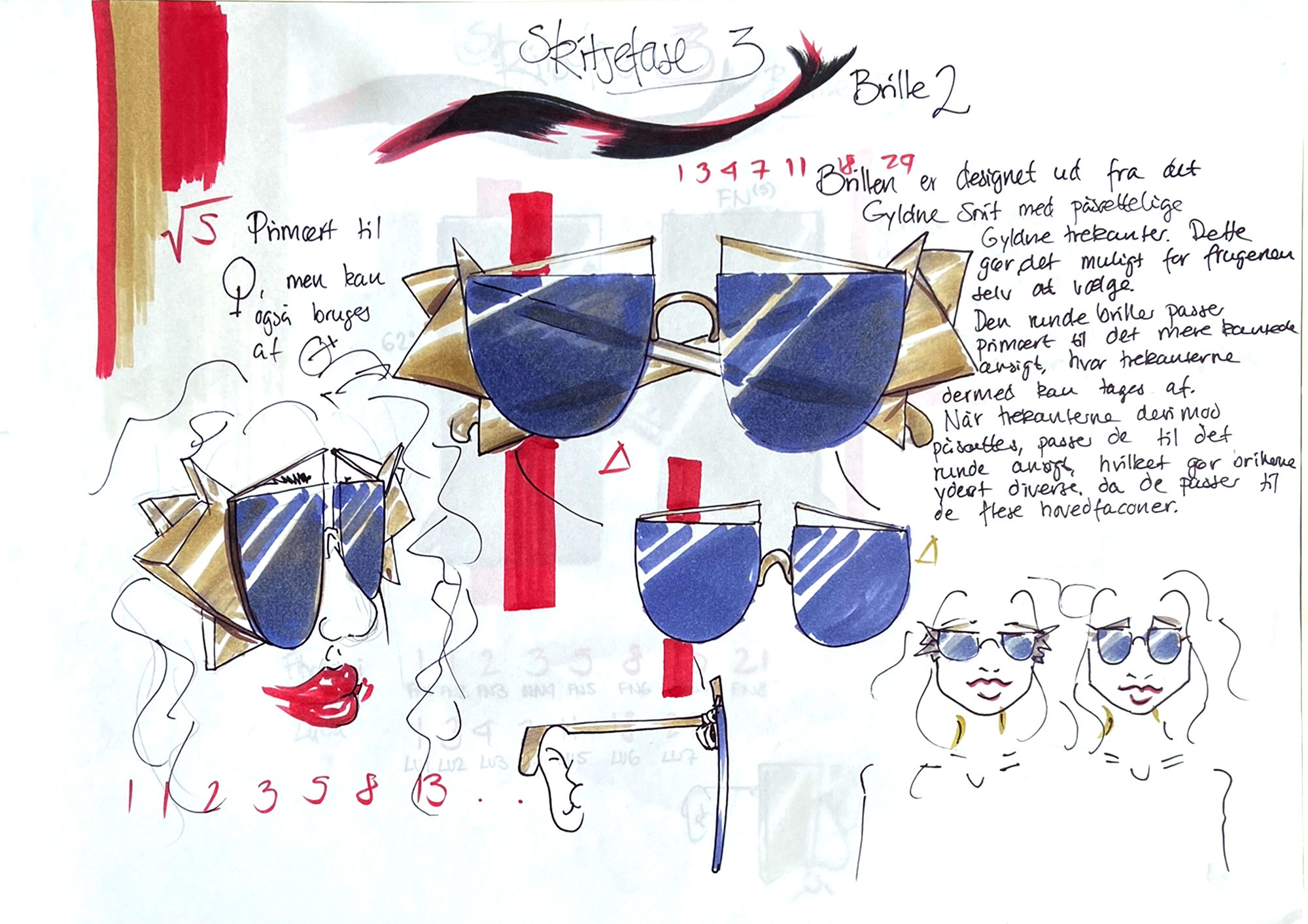 Færdige produkt blev afleveret som 40 siders hæfte med designprocess og skitser for alle fire briller. Her er blot dokumenteret en del af dem.
